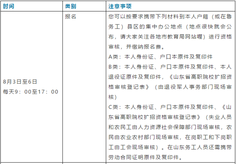 C类:本人身份证、户口本原件及复印件、《山东省高职院校扩招资格审核登记表》(失业人员和农民工由人力资源社会保障部门现场审核,农民由农业农村部门现场审核,在岗职工和下岗职工由工会现场审核)。在山东务工人员还需携带劳动合同证明原件及复印件。